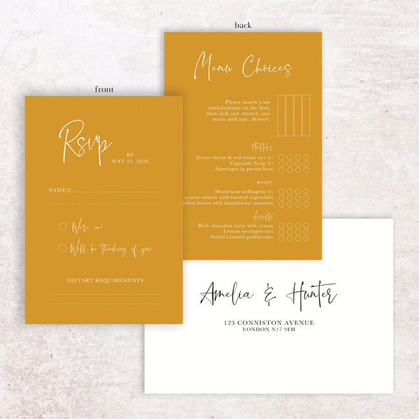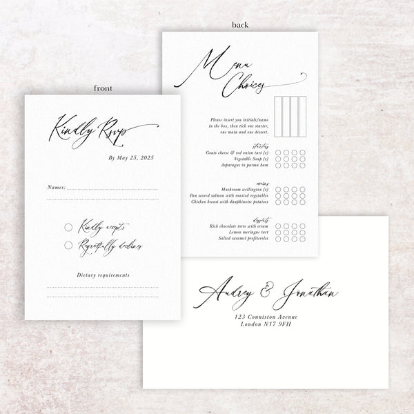 This RSVP menu card is beautifully printed on luxury coloured cardstock to match your wedding theme, printed an light colours that guests can select their options and return back to you in the addressed envelope. Choose from a range of colours and cardstock shapes.