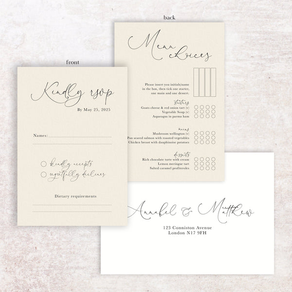 Standard rectangle card is 15.6cm x 10.8cm printed back to back and comes with a C6 addressed envelope for guests to return back to you.