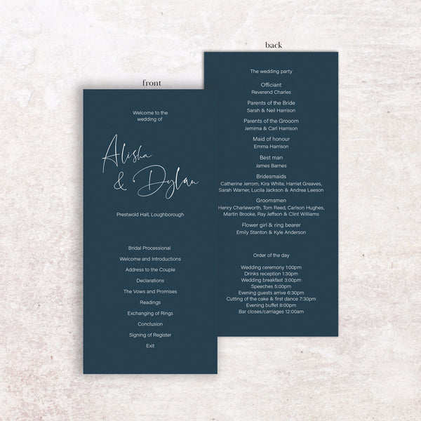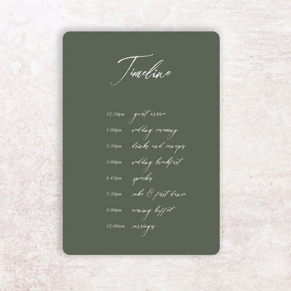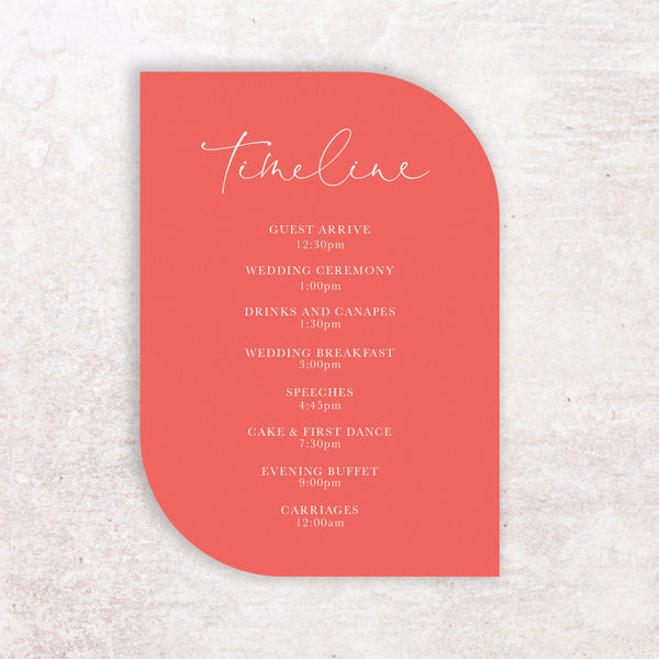 This timeline card is beautifully printed on luxury coloured cardstock to match your wedding theme. Choose from a range of colours and cardstock shapes.