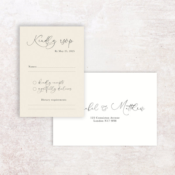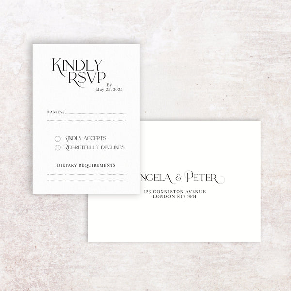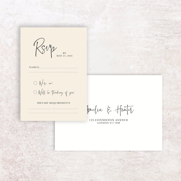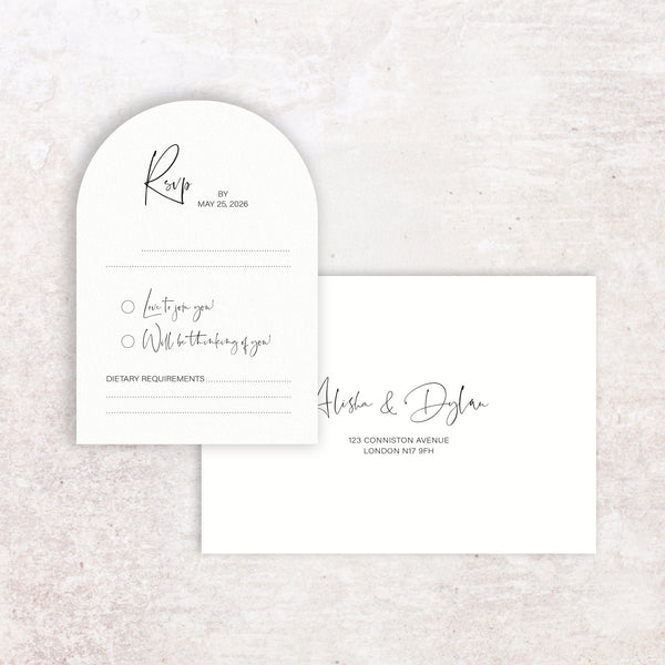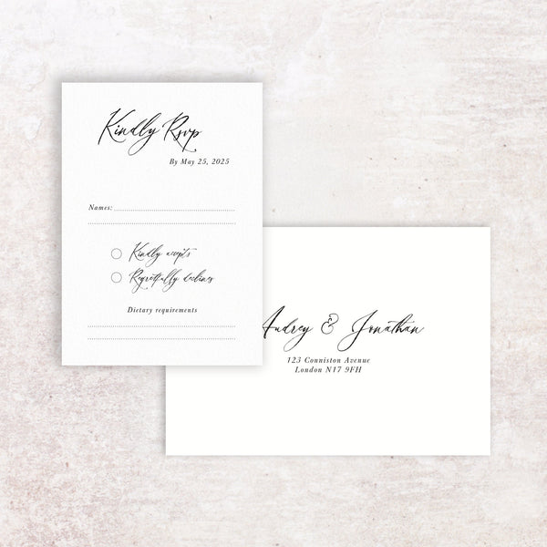 This elegantly crafted RSVP card and envelope are printed on luxurious colored cardstock, perfectly tailored to complement your wedding theme. Select from a variety of colors and cardstock shapes to match your style.