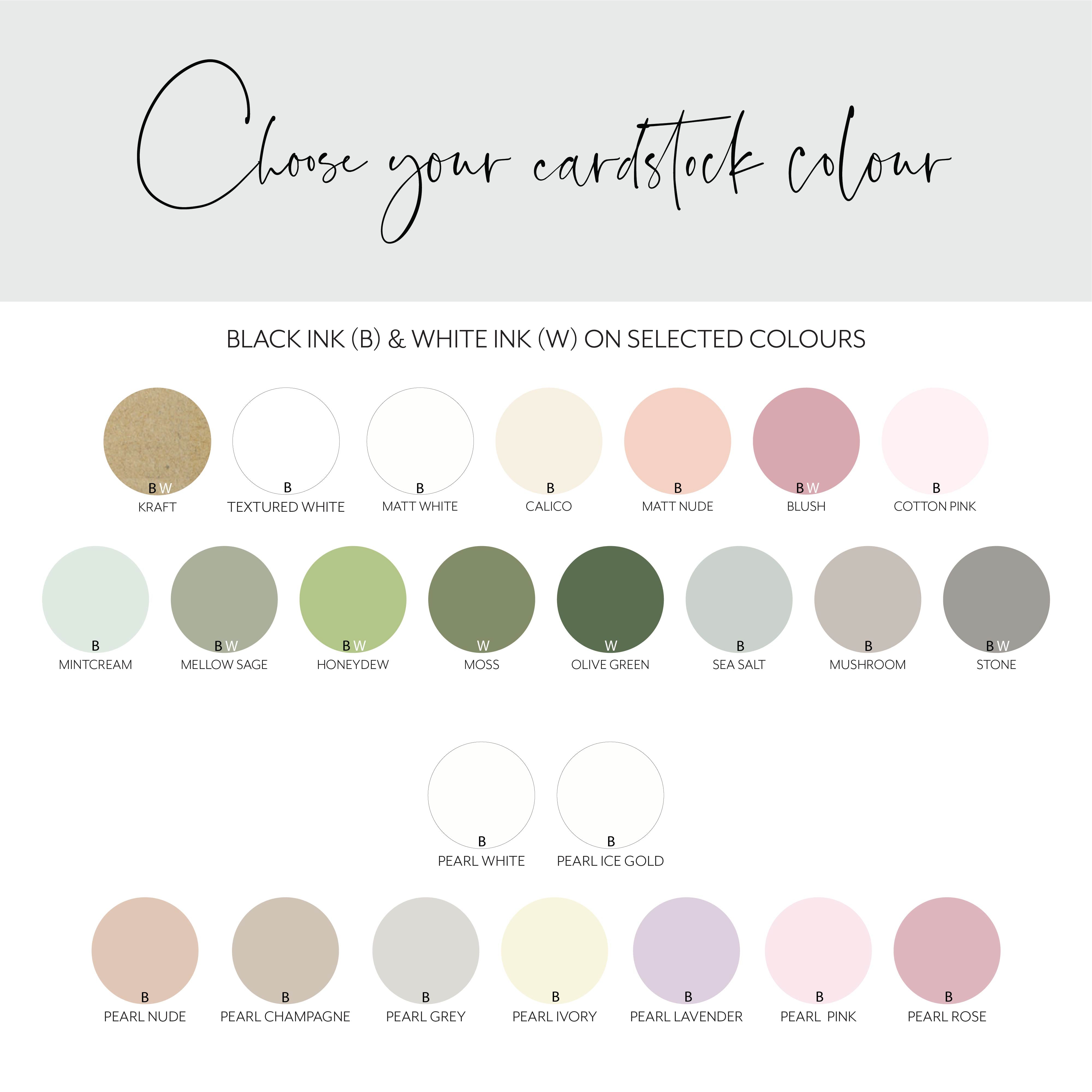 Beautifully printed on luxury coloured cardstock to match your wedding theme. Choose from a range of colours with a choice of standard envelopes or coloured envelopes (from the collection page)