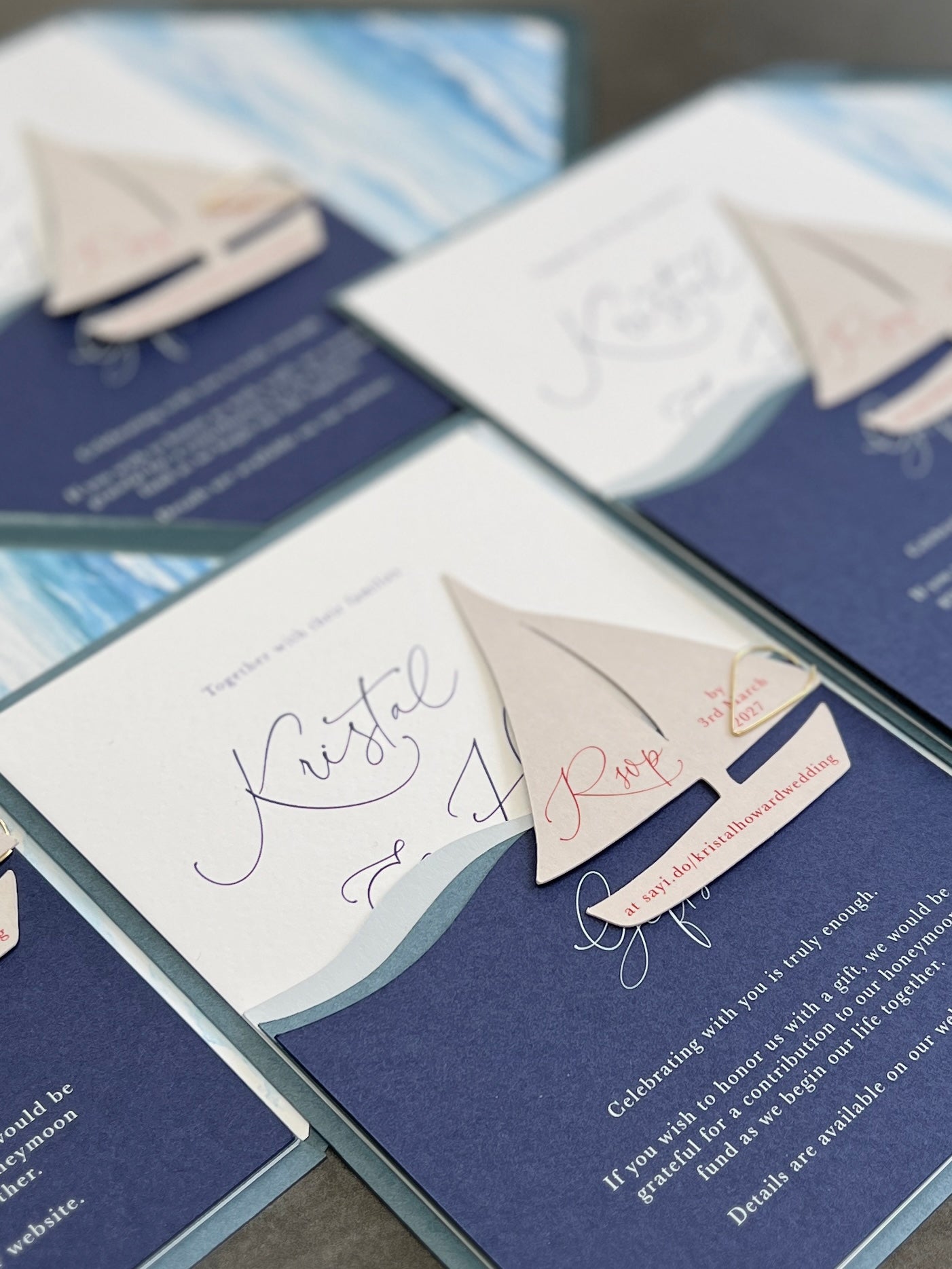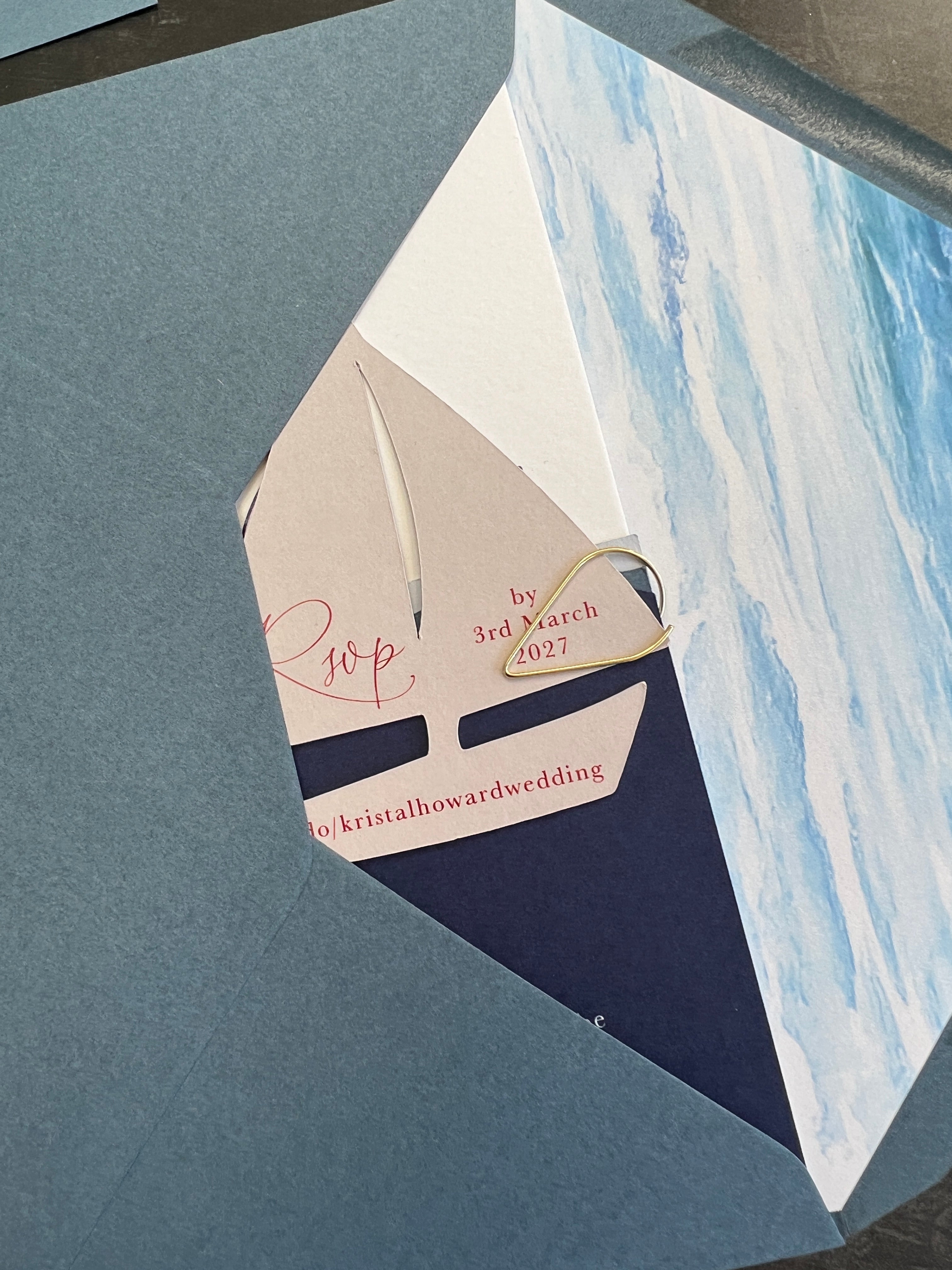 This luxury nautical wedding invitation features an elegant sail boat design layered over a rich navy blue luxury card, creating a refined and dimensional finish. Inspired by coastal romance and yacht club sophistication, this sail boat wedding invitation is perfect for seaside, waterfront, and destination weddings.