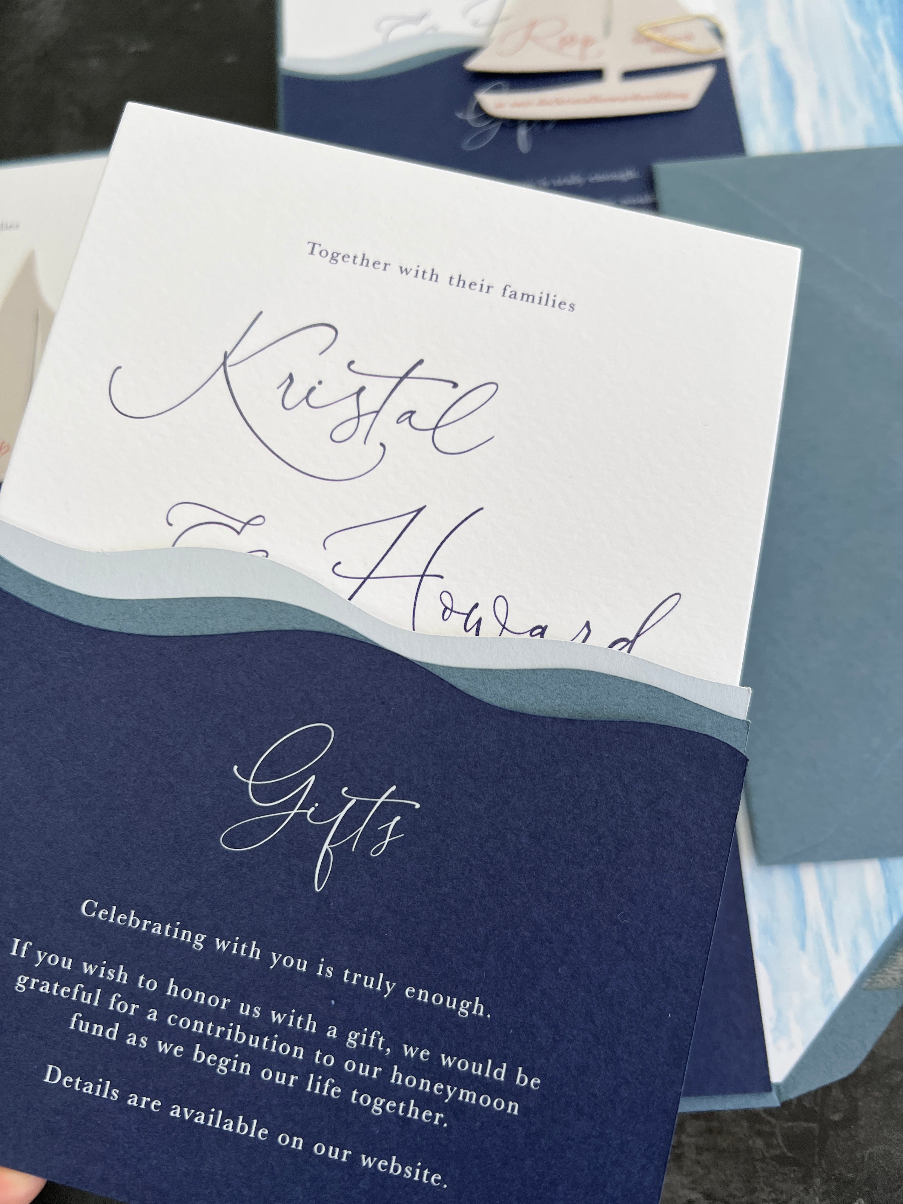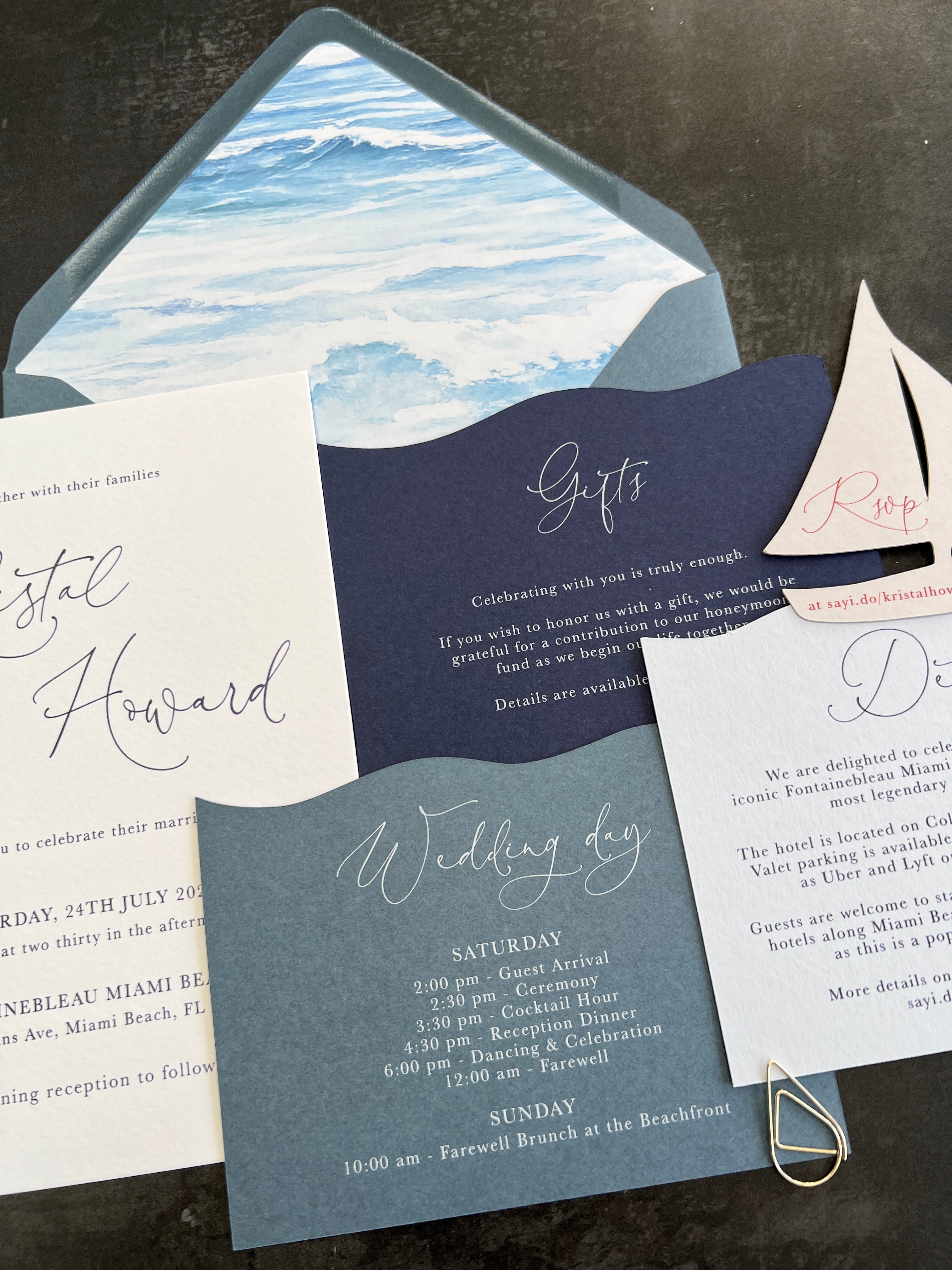 Crafted with premium materials, sculpted layering, and timeless typography, this nautical wedding invitation suite makes a striking first impression. The intricate sail boat detail adds texture and movement, while the deep navy palette enhances the overall luxury card aesthetic.
